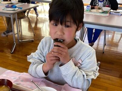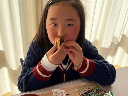 今年の恵方は北北西 2年生が北北西を向いて、黙ってパクリ、と食べている様子です!