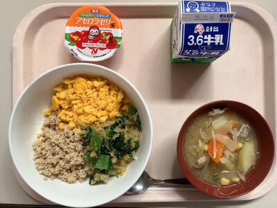 12月5日(金)の給食 投稿日時 : 12:30 芳賀北小学校管理者 カテゴリ: 三色丼 どさんこ汁 アセロラゼリー 牛乳 {{options.likeCount}} {{options.likeCount}}