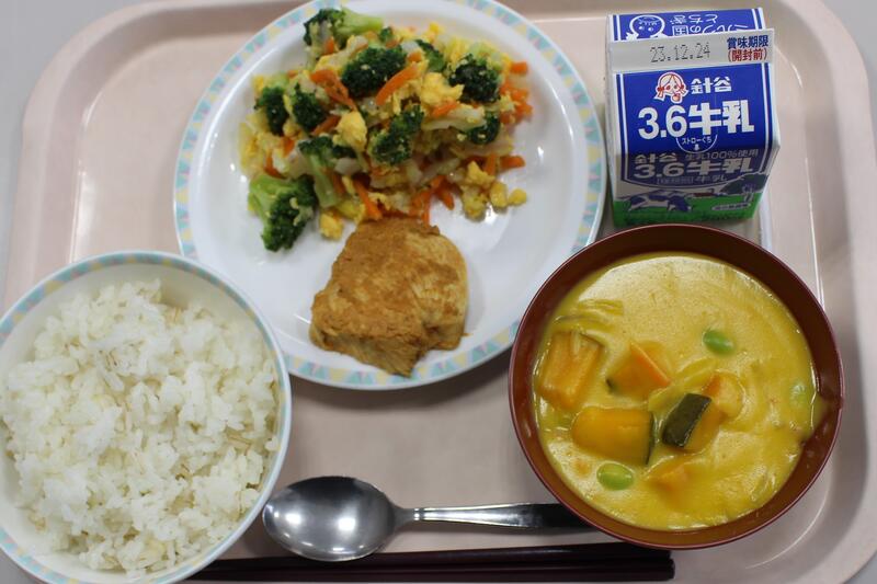 ごはん、牛乳、タンドリーチキン、彩りサラダ、かぼちゃのポタージュ