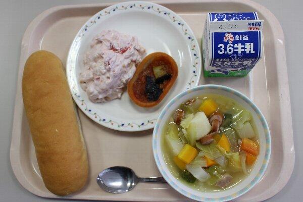 ごはん、牛乳、鶏の南部焼き、ごぼうサラダ、豚汁、ぶどうゼリー