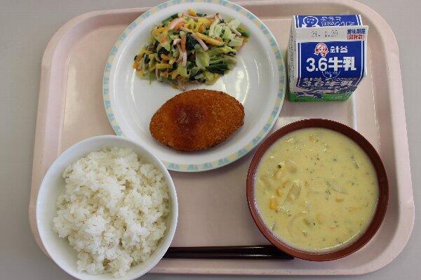 ごはん、牛乳、野菜コロッケ、コールスロー、コーンポタージュ