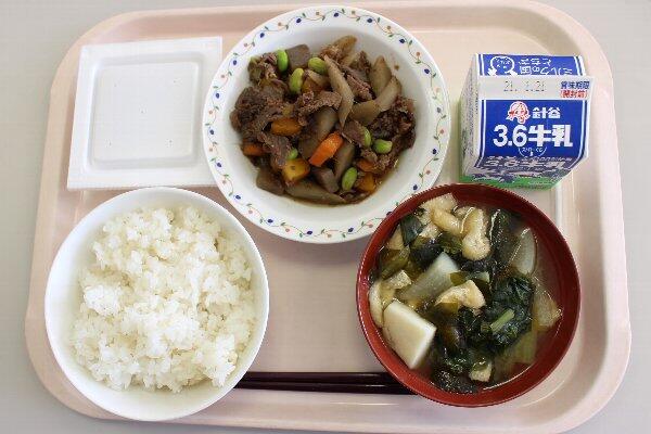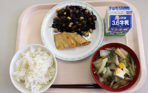 ごはん、牛乳、シロイトタラの西京焼き、ひじき煮、みそ汁
