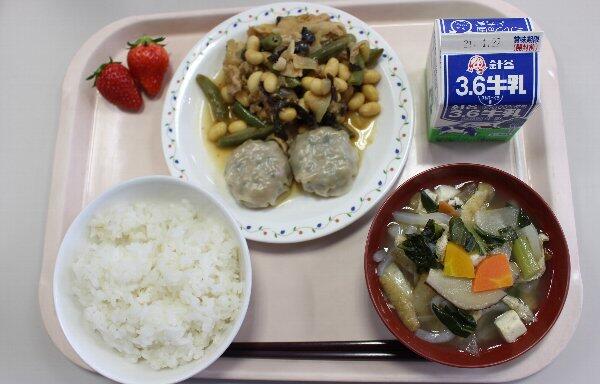 ごはん、牛乳、豚肉と大豆のみそ炒め、にらまんじゅう、塩けんちん汁