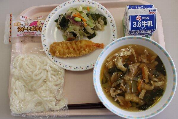 肉うどん、牛乳、えび天、海藻サラダ、スイートポテト