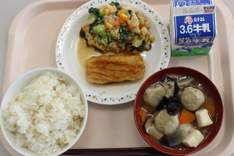 キムタクごはん、牛乳、ごま酢あえ、五目玉子焼き、ちんげん菜のスープ