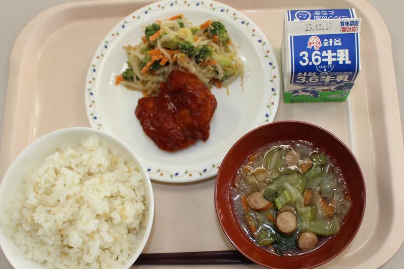 ごはん、牛乳、鶏のバーベキューから揚げ、セサミサラダ、白菜のスープ