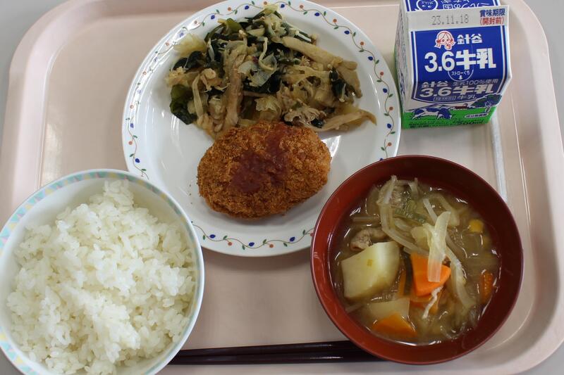 ごはん、牛乳、まぐろカツ、きのこの和風サラダ、どさん子汁