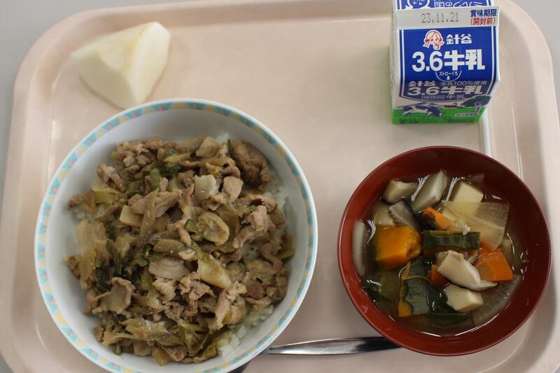 豚丼、牛乳、みそ汁、芳賀町産梨(王秋 おうしゅう)