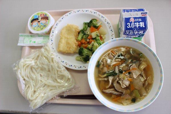 肉うどん、牛乳、いかの天ぷら、花野菜のサラダ、カムカムりんごゼリー