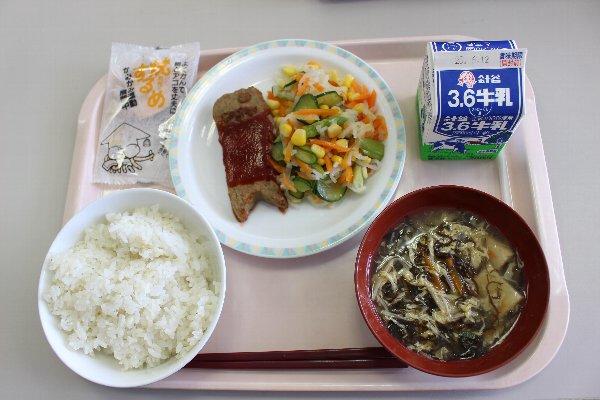 ごはん、牛乳、ハンバーグ、シャキシャキサラダ、もずくのスープ
