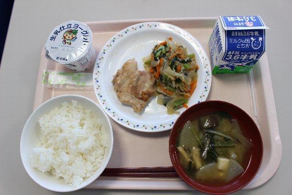 ごはん、牛乳、県産豚のしょうが焼き、芳賀町産しいたけとがんもの煮つけ