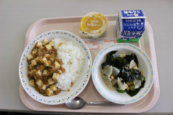 ごはん、牛乳、マーボー豆腐、芳賀町産野菜の中華あえ、和梨ゼリー