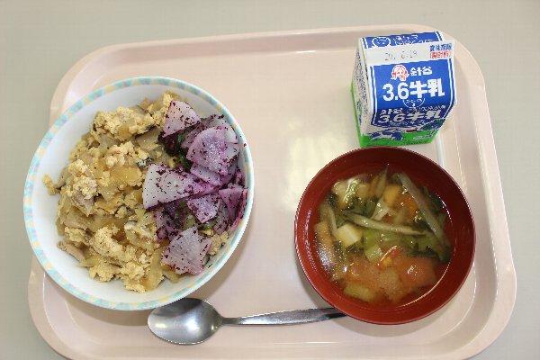 芳賀町産野菜使用の親子丼、牛乳、芳賀町産野菜のゆかりあえ、芳賀町産野菜のみそ汁