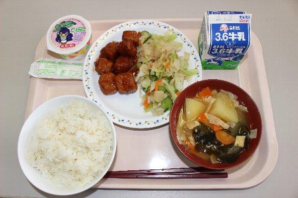 ごはん、牛乳、ぶたとごぼうのかりんあげ、かみかみあえもの