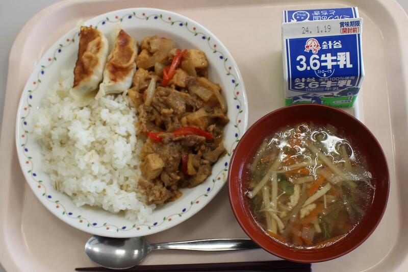 ごはん、牛乳、豚肉と生揚げのぴり辛みそ炒め、焼きぎょうざ、沢煮椀