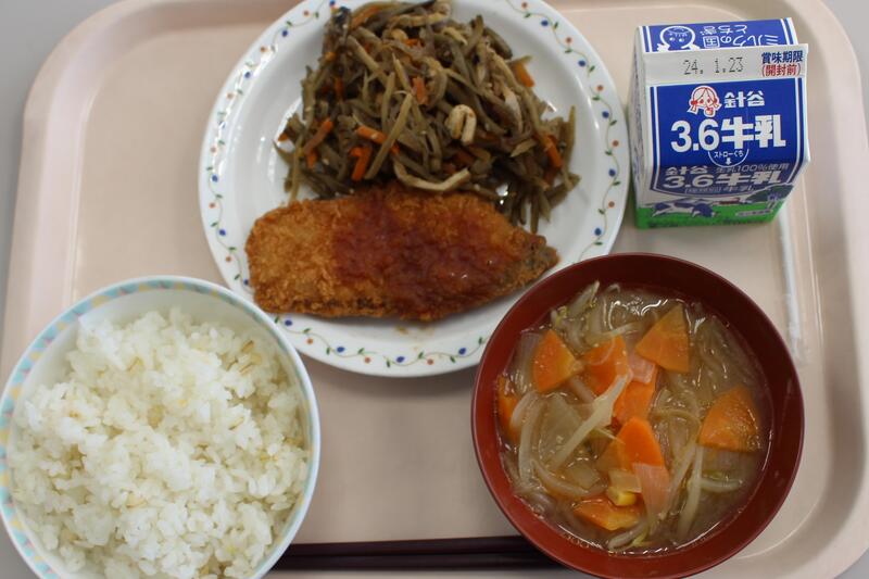 ごはん、牛乳、サーモンフライ、きんぴらごぼう、どさん子汁