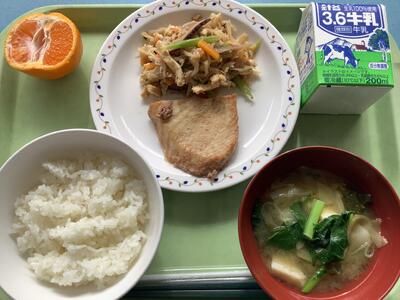 ごはん 豚肉とごぼうのカリン揚げ お浸し スープ かみかみ昆布 牛乳
