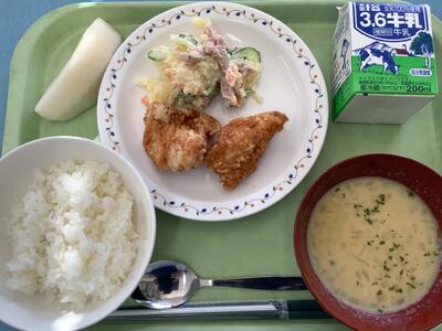 ごはん 唐揚げ ポテトサラダ コーンスープ 梨 牛乳