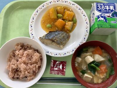 赤飯 サワラの味噌漬け焼き 南瓜のそぼろ煮 いものこ汁 牛乳