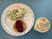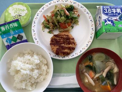 今日の給食は鶏のパン粉焼きの予定でしたが、都合によりハンバーグに変更になりました。