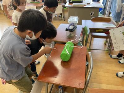 予想→実験→新たな疑問→予想→実験→新たな疑問・・・・・・・6年生全員が校長先生の授業に引き込まれ、理科の楽しさを存分に味わった1時間となりました。