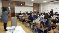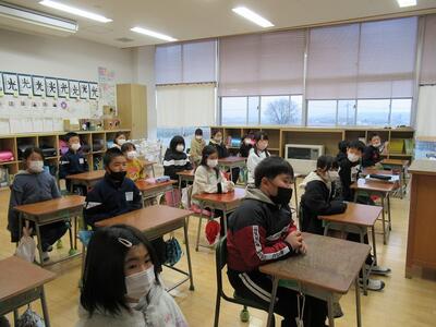 次の修了式では、各学年ごとに校長先生から修了証書が代表児童に授与されました。代表児童に合わせて、全員が教室で起立、礼をして授与されました。