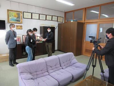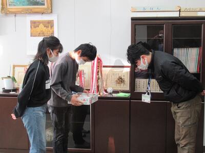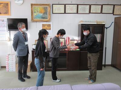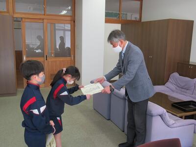 11月8日の昼休みに、5年生が収穫したお米を、5年生の代表の二人から社会福祉協議会に寄贈しました。