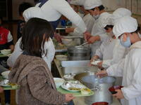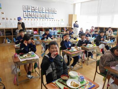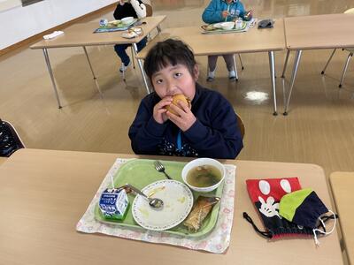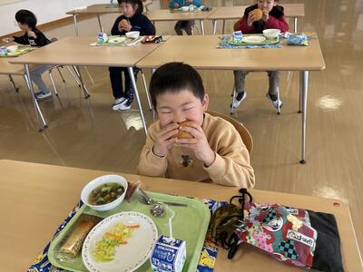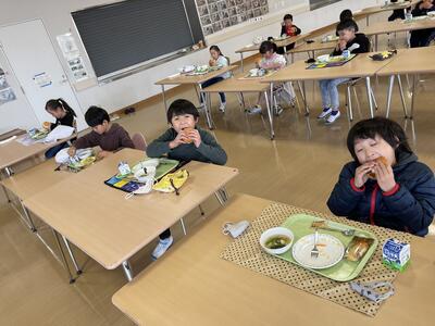 給食の様子です。17日は6年生最後の給食のため、とても豪華な給食でした。大きなエビフライや高級アイスに大興奮です。