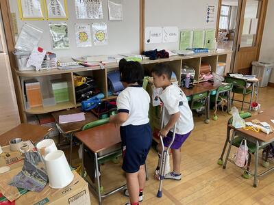 2年生が生活科で作ったおもちゃで、お店やさんを開きました。1年生を御招待して、楽しく遊びました。