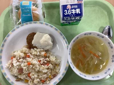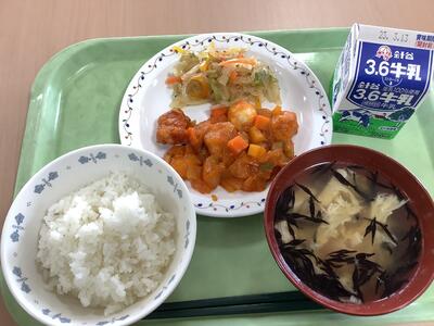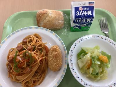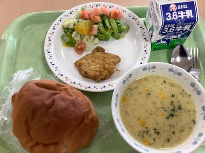 レモンの酸味とはちみつの香りが食欲をそそります。外側はパロパリ、内側はふっくら、しっとりととした食感でおいしかったです。ポークビーンズのトマトソースを合わせて、おいしい!と2年生が絶賛してくれました。
