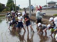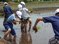 晴天の下、5年生が、総合の学習で、田植えを体験しました。