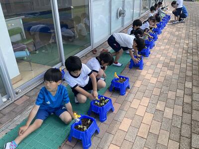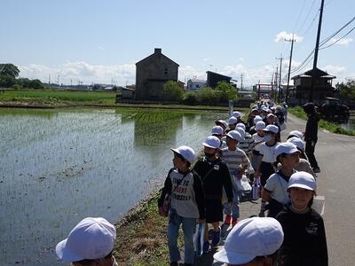 今年度は大島さんに御指導をいただき、田植えを行いました。初めて田植えをする児童も多く、田んぼの中に入る時には歓声が上がっていました。一生懸命活動し、日々美味しいお米が食べられることへの感謝の気持ちが高まった思います。