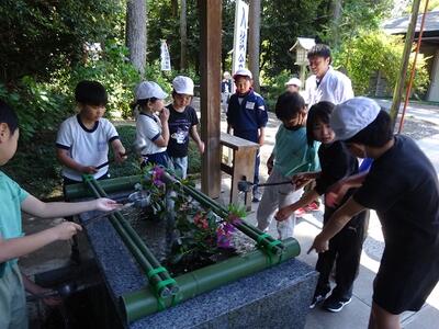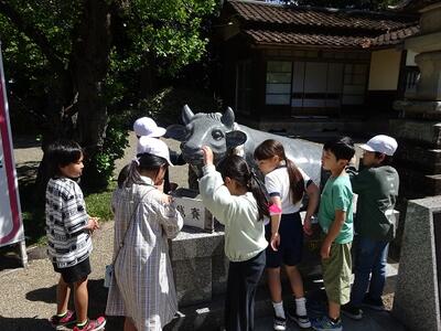 天満宮では、子供たちは思い思いにお参りをしたり休憩したりしていました。