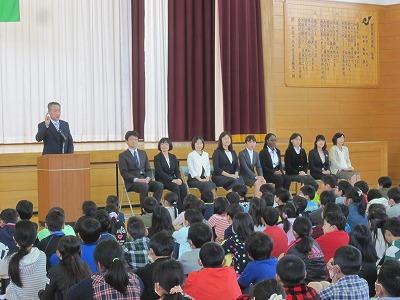 6年生の代表児童が歓迎の言葉を読み、お互いに「よろしくお願いします。」のあいさつをしました。