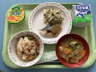 きのこおこわ 焼き魚(サバ) ごまマヨ和え 味噌汁 かぼちゃプリン(豆乳入り) 牛乳