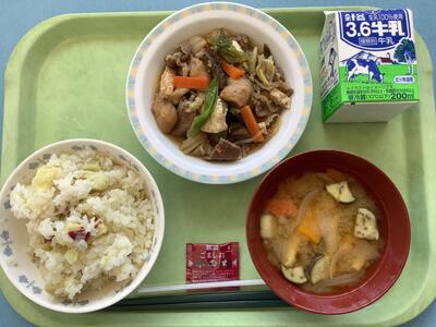 さつまいもごはん すき焼き風煮 味噌汁 牛乳