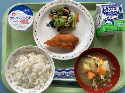 麦ごはん カレイのザンギ揚げ 辛子和え どさんこ汁 フローズンヨーグルト 牛乳