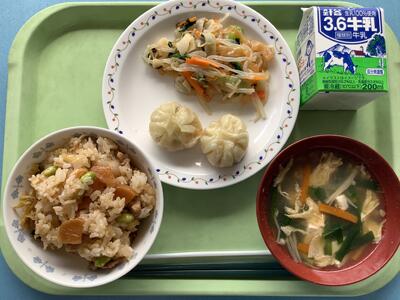 栗おこわ 竹輪の二色揚げ (青のり・カレー) 五目きんぴら かきたま汁 牛乳