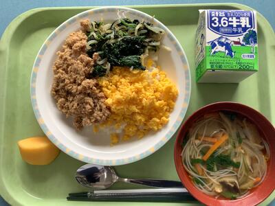 ピーマンピッコロライス ツナマヨオムレツ スープ お楽しみデザート 牛乳