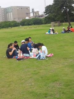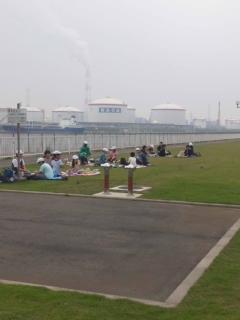 製鉄所の見学が終わり、港公園で昼食を食べています。