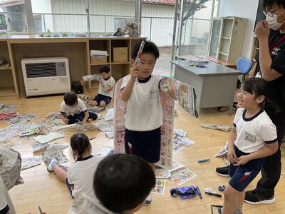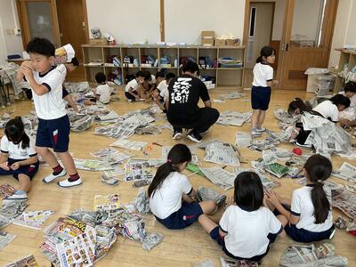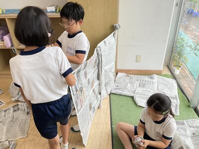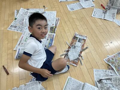 図工では「新聞紙となかよし」の学習で、新聞紙を使ってたくさん作品を作りました。