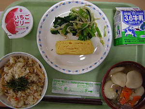 牛乳 たけのこご飯 厚焼き卵 おひたし すいとん汁 ゼリー