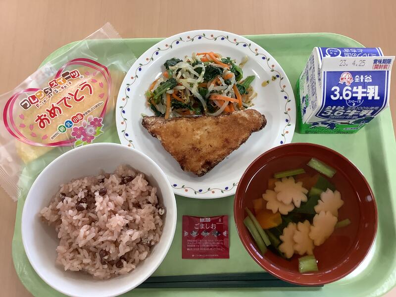 児童の皆さん、入学、進級おめでとうございます。今日は皆さんへのお祝い献立です。新生活はいかがですか?今は給食を全部食べられない人がいるかもしれません。まずは無理をしないで、少しずつ食べられる量を増やしていけるとよいですね。苦手なものがある人も、全部残すのではなく、一口食べてみてください。給食は食べやすいように、いろいろ工夫してあるので、「あれ?苦手なはずなのに、おいしい、食べられる」かもしれません。