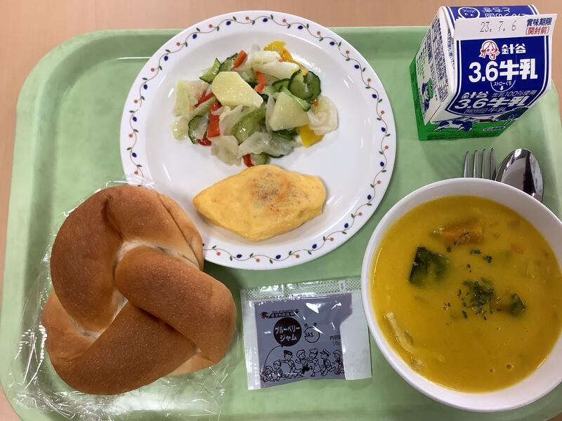 メニュー:ジョアマスカット又はブルーベリー、煮魚又はチキンのオーブン焼き、すまし汁又はパンプキンスープ、サラダ(ごまドレッシング又はマヨネーズ)、レモンカスタードタルト又は豆乳プリン、付け合わせにブロッコリー、オレンジ、ご飯、プチパン