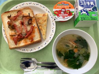 ピザトースト アンサンブルエッグ あさりとコーンのスープ お楽しみデザート 牛乳