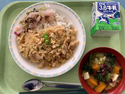 京都衣笠丼 しば漬け和え いとこ汁(南瓜と小豆) 牛乳