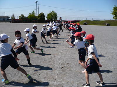 今日はとても天気がいいので、外で元気に体育をやりました!