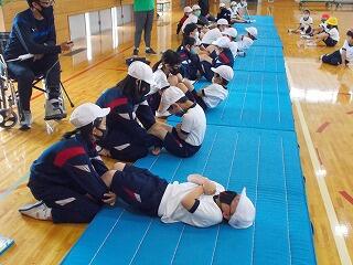 芳賀中スクールカウンセラーの福田先生が、簡単な運動で脳を活性化させる教育方法の一つである「ブレインジム」を教えてくださいました。