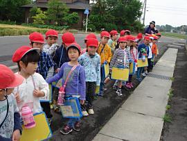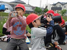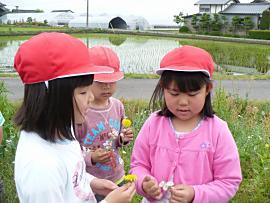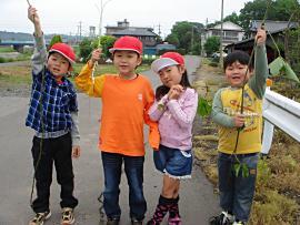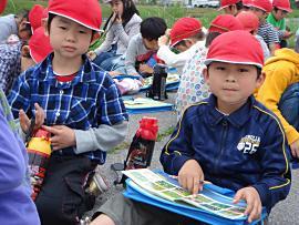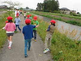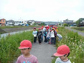 平成25年5月20日(月)1校時~業間、生活科の「がっこうのまわりをよくみてあるこう」の学習で、学校周辺の探検をしました。123号線沿いを歩き、森肉屋さん前を通り、野元川周辺の散策をしました。前夜が雨、当日が曇りでしたが、子どもたちは、ひばり、ちょう、あり、てんとうむし、だんごむし、かたつむりなどの生き物を発見でき、うれしそうでした。野元川周辺では、草花の花束やたんぽぽの首飾り作り、のびる集め、くずのくきでなわとび・戦いごっこ・冠作り、草花の種集めなど、思い思いの自然遊びを楽しみました。自然のおもしろさとともに春から初夏の町(学校周辺)の様子なども感じられたひとときでした。