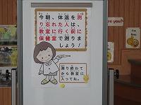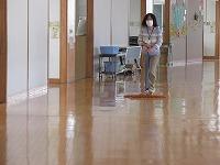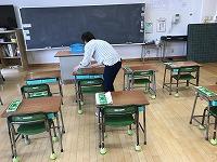 感染予防のため今日は職員で手分けをして、室内の掃除や消毒をしたり、間隔を空けて並べるように流しの前に印をつけたりしました。